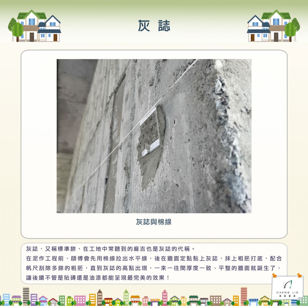 以RC造建築為例,牆面灌漿、拆除模板、養護期結束後,便會進入泥作工程,施工前師傅會先使用棉線拉出水平線,後在牆面定點黏上灰誌,其棉線與牆的距離就是泥作施作的厚度。