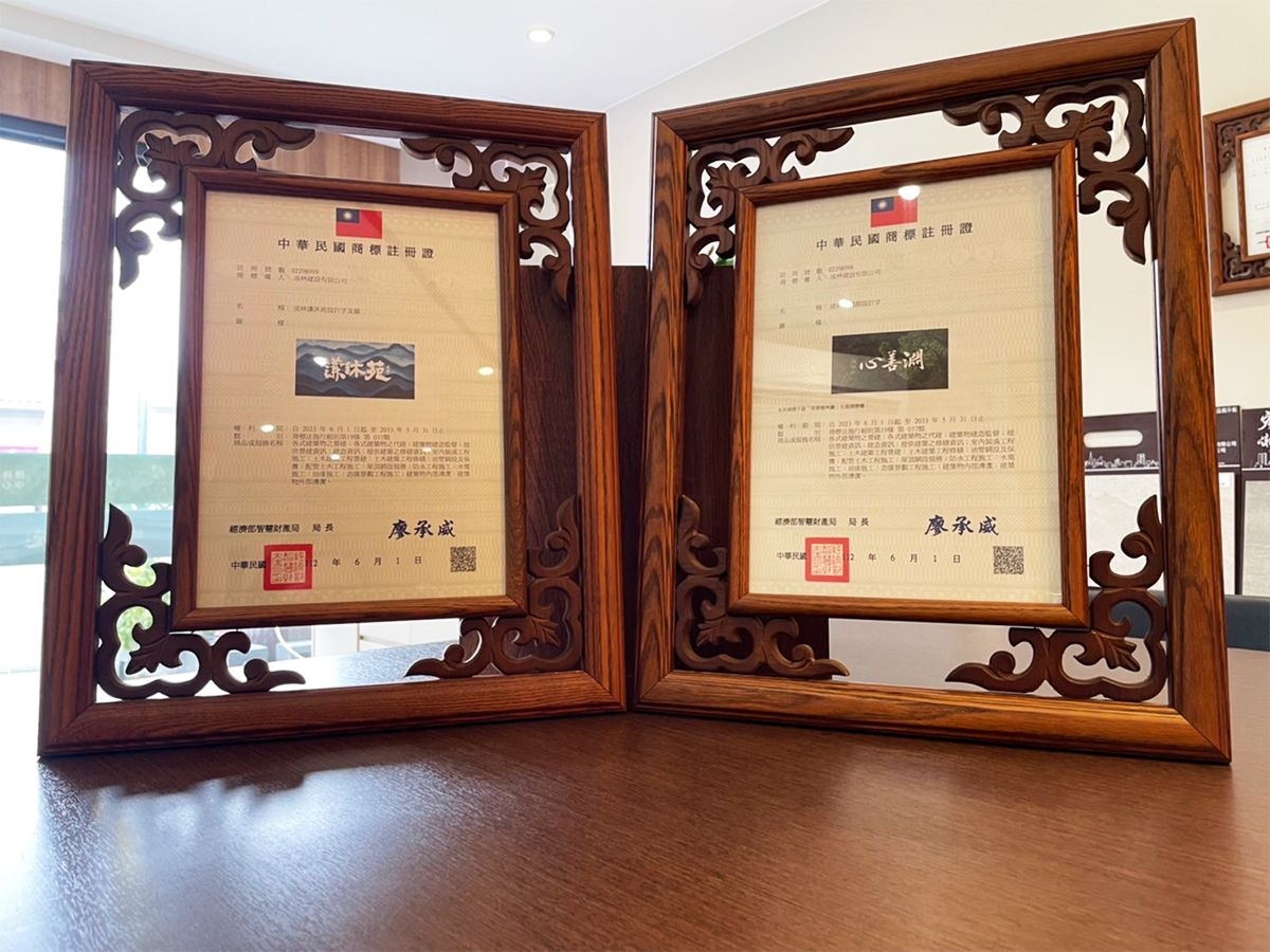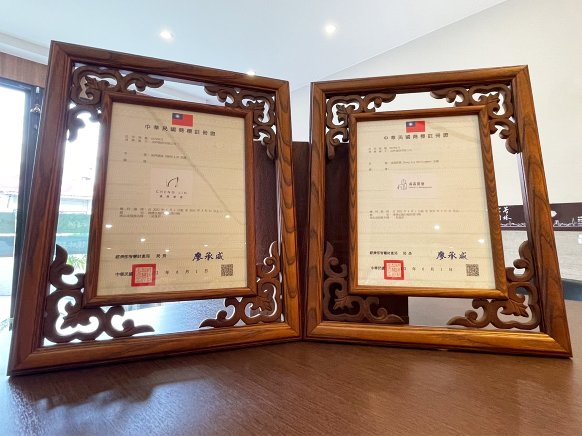 成林建設為公司與旗下產品成林心善淵、成林謙沐苑申請註冊商標權,為每位貴客獻上獨一無二的夢想家園,彰顯每位貴客的尊榮身份!