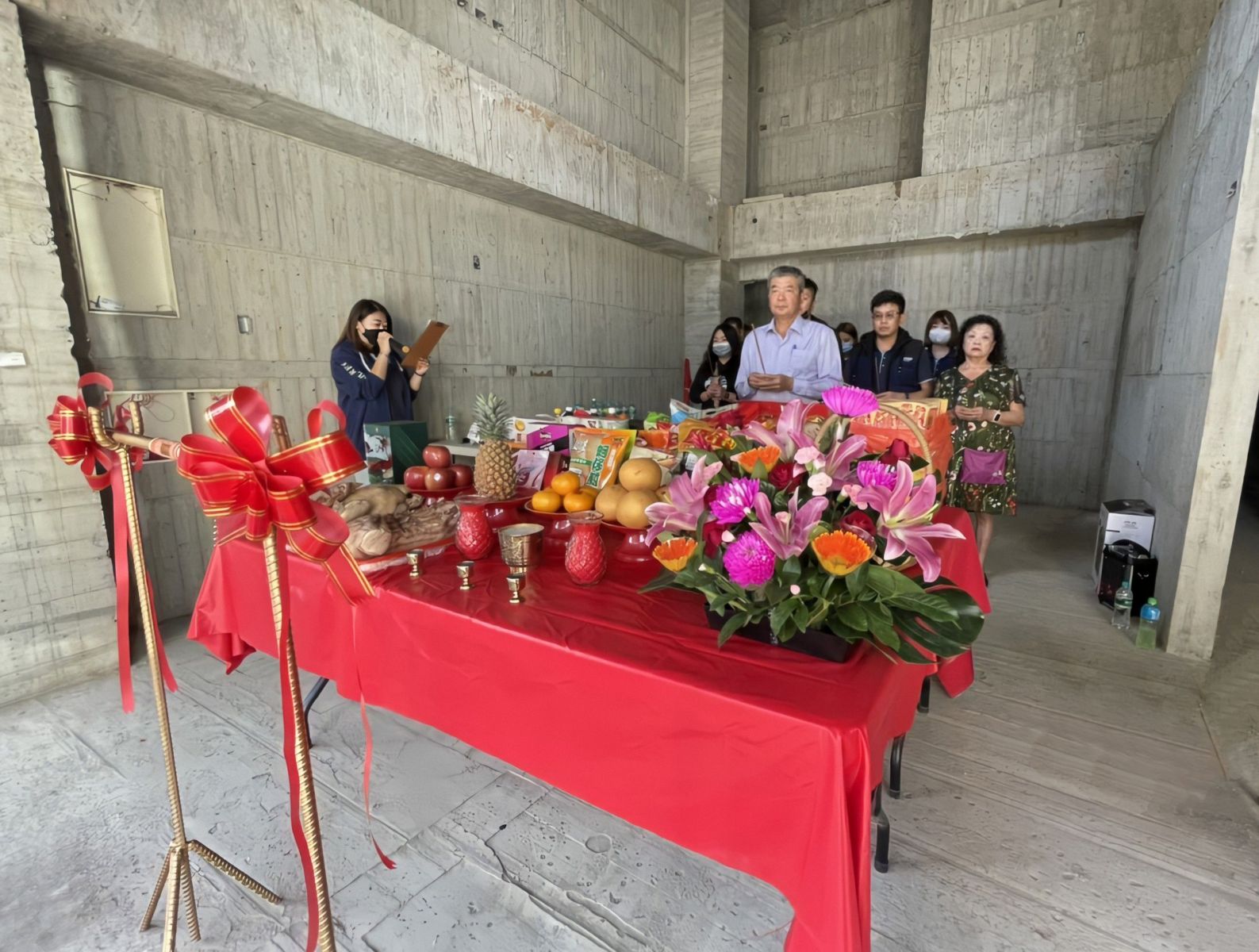 良辰吉時,在林利款 董事長與董事長夫人 陳麗玲女士的帶領下,感謝天地百來天的祝福讓工程一路順利,感謝一路辛勤陪伴成林謙沐苑成長的同仁們,更祈福日後興建工程平安、順遂,房屋永固!
