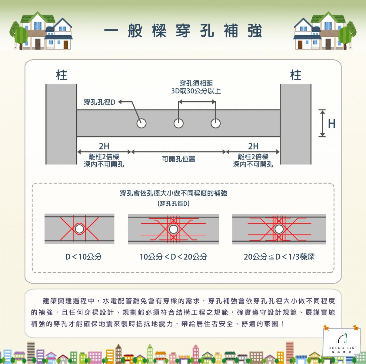 「一般樑穿孔補強」會依穿孔孔徑大小做不同程度的補強,且任何穿樑設計、規劃都必須符合結構工程之規範,確實遵守設計規範、嚴謹實施補強的穿孔才能確保地震來襲時抵抗地震力,帶給居住者安全、舒適的家園!