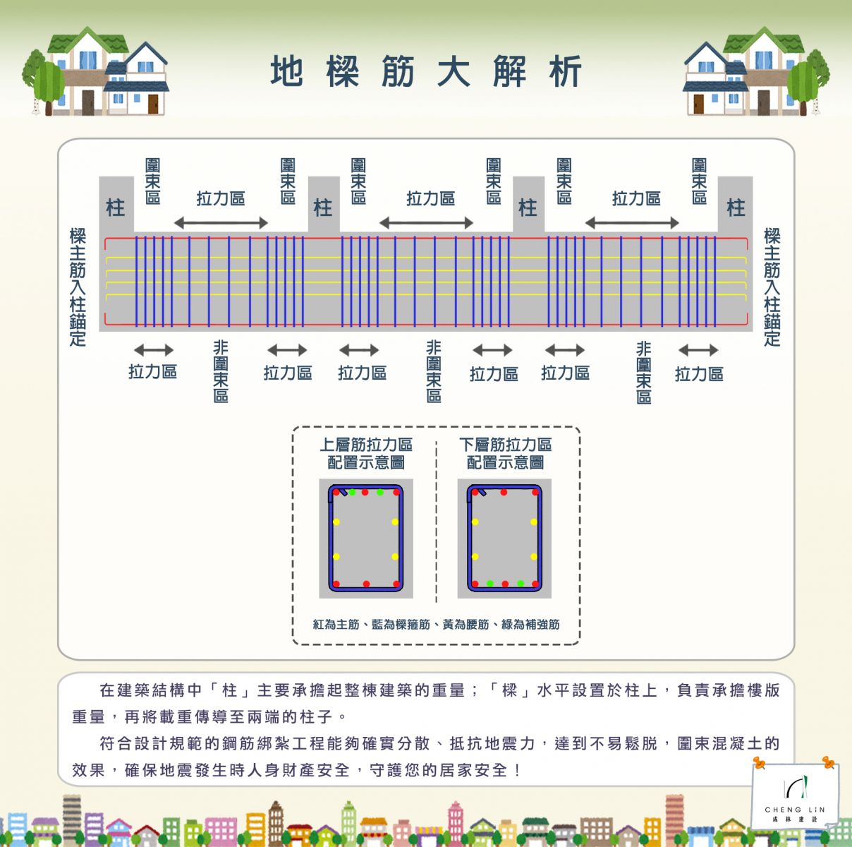 結合前幾篇的工程小知識,一路帶大家解析了柱、一般樑、地樑的鋼筋組立與配置,了解建築工程中的精細與奧妙,從設計規劃、鋼筋綁紮、混凝土灌漿,所有細節環環相扣,只為確保地震發生時人身財產安全,守護您的居家安全!