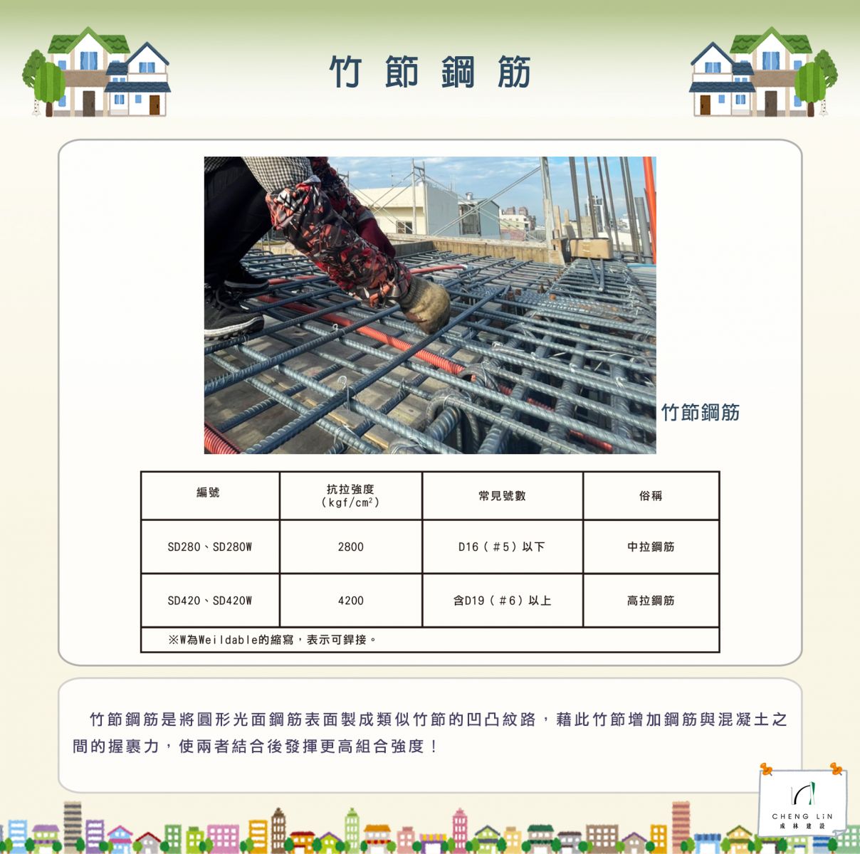 根據CNS 560【鋼筋混凝土用鋼筋】之規定,依鋼筋強度竹節鋼筋可分為SD280、SD280W、SD420、SD420W等不同型號,其解釋如下:
